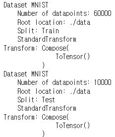 뭔가 데이터는 다운 받아서 왔고, 학습에 6만개, 테스트에 1만개인 것은 알겠는데, numpy에서 보던 (60000, 28, 28) 뭐 이런 식의 shape이 아니라서 알 수가 없다. 게다가 batch 크기로 나누어 놓은 loader의 경우도 데이터의 크기를 바로 알 수 있는 형태가 아니다.